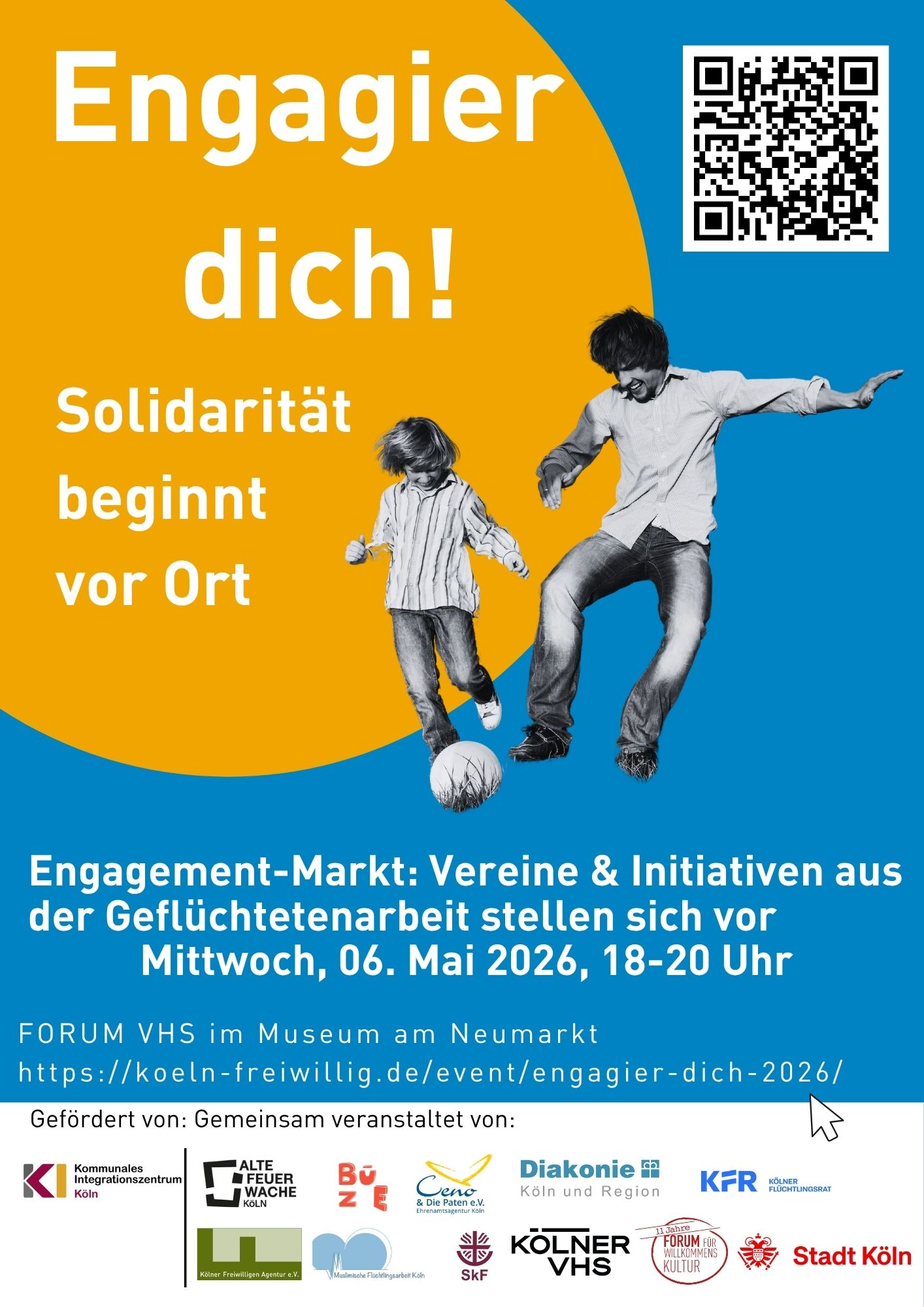 Willkommenskultur entsteht nicht von selbst – sie lebt vom Mitmachen! In Köln setzen sich zahlreiche Vereine, Initiativen und Projekte für ein Zusammenleben von Menschen mit und ohne Fluchterfahrung ein. Sie suchen engagierte Unterstützung! Die Engagementbörse „Engagier dich!“ bringt Neugierige und Engagierte zusammen: zum Kennenlernen, Austauschen und Ausprobieren. Vereine und Initiativen können sich beim Markt der Möglichkeiten präsentieren und neue Mitstreiter:innen gewinnen – Anmeldungen sind herzlich willkommen!